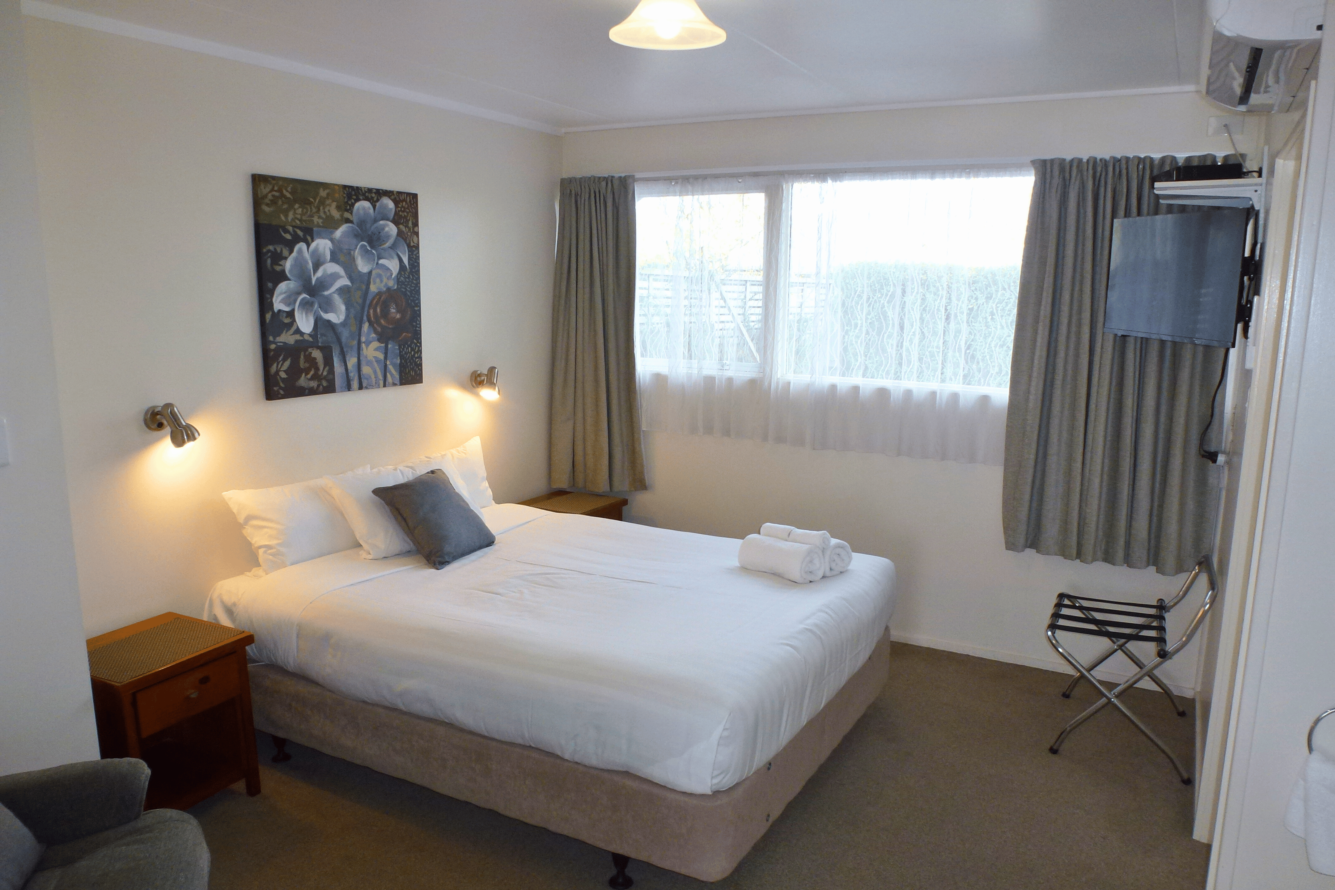 Budget Studio unit with a Queen bed. Kitchenette with tea and coffee making facilities. Shower, Vanity and Toilet. Parking at the door. 32 inch Smart TV, Sky + Apps and Wifi. Smaller room great for 1 night, Max guests 2, no children, no pets